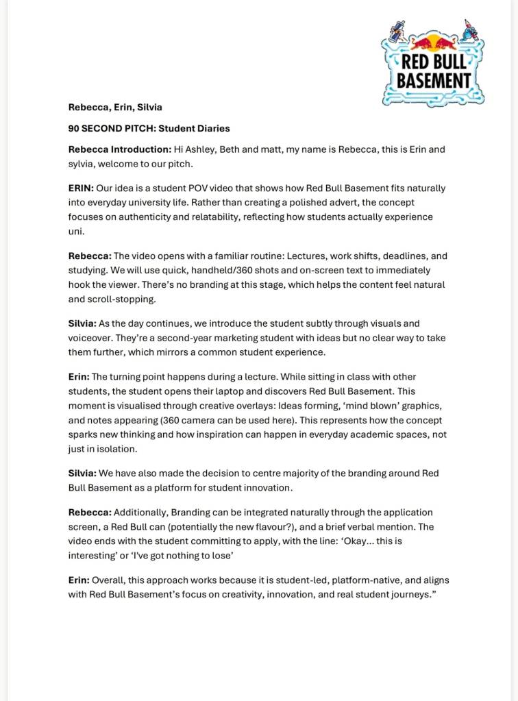 In our final preparation for the client pitch, where we will present our concept to the Red Bull team, we used the session to refine and strengthen every element of our proposal. We began by finalising the overall pitch structure, deciding on a clear introduction, middle and conclusion so that the problem, idea and expected impact would flow logically for the audience. We then clarified our core concept in simple, memorable language and sharpened our opening hook to quickly capture attention and signal why our UGC POV video is relevant for Red Bull Basement and its student audience. At the same time, we started to map out a basic shot plan, identifying the key moments, angles and transitions that would best communicate the narrative within a short‑form TikTok format. This planning helped us anticipate practical challenges and ensured that our creative vision remained realistic. Finally, we rehearsed how we would share speaking roles within the group so that each member could contribute confidently, aiming to present our idea with a professional, well‑prepared and collaborative impression.